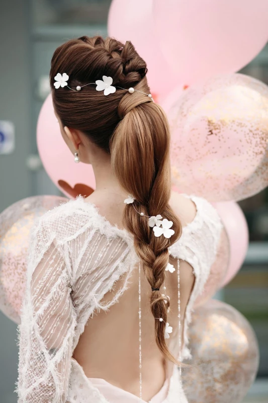 Ponytails have a classic appeal, and you can update this look for your perfect wedding day in a number of different but equally stunning ways. You have many options to choose from when it comes to styling your hair into a ponytail, giving you the freedom to go for a sleek and straight high ponytail or a curly and messy low ponytail that rests close to your head. To make their hairstyle stand out even more, some brides choose to accessorize their ponytails with natural flowers, bows, brooches, or other hair accessories.