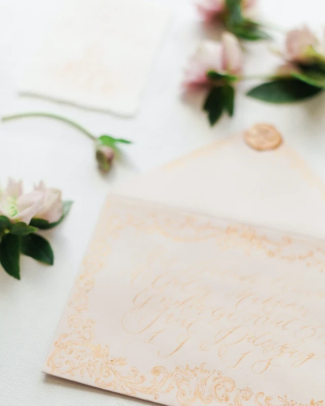 Tuscany's summer wedding season unquestionably screams for a touch of romance. For a sophisticated appearance, this design included calligraphed lettering, gilded accents, and textured paper edges.