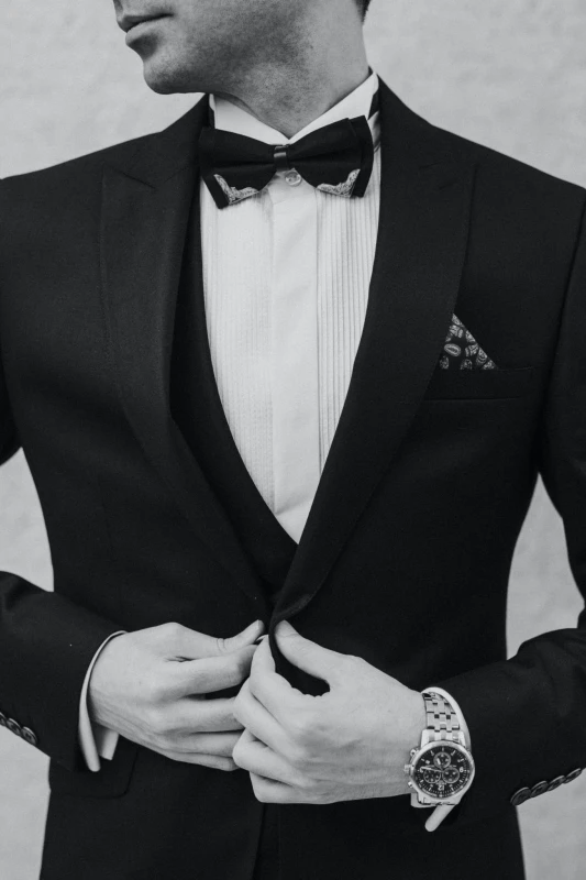 Don't overdo the accessories; keep it understated. Together with your bow tie, you can accessorize with a pocket square, a boutonniere, or a single white rose on your left lapel to match your wedding bouquet. Cufflinks are a necessity, even though suspenders are an optional finishing touch. They're the ideal finishing touch for your outfit; keep them traditional with round or square-shaped silver or black onyx.