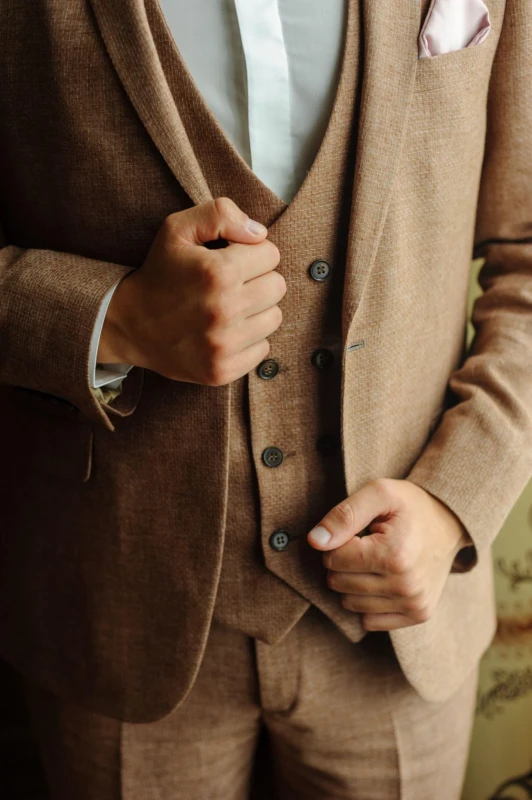 We advise selecting a three-piece in one colour for your perfect wedding day. Even when you take off your jacket, a double-breasted vest will give you a structured silhouette that will wrap around your waist and keep you looking put together. A shawl or peak collar invokes the savoir-faire of Savile Row and elevates the look of the outfit. Wear with accouterments meant to heighten your sense of style, like pocket squares in matching hues, but aim to draw attention to the outfit below.